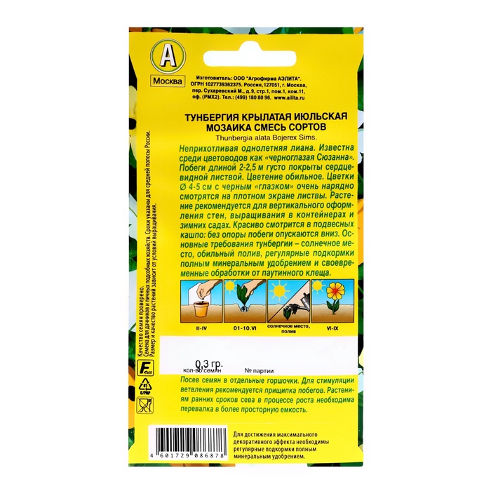 Семена цветов тунбергии «Июльская мозаика» подойдут для создания ярких цветников и клумб. Эта цветущая культура радует глаз своими красивыми микс-композициями на протяжении летнего периода. Прекрасный выбор для любителей однолетних растений, которые предпочитают светолюбивые виды.