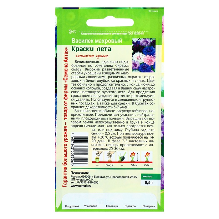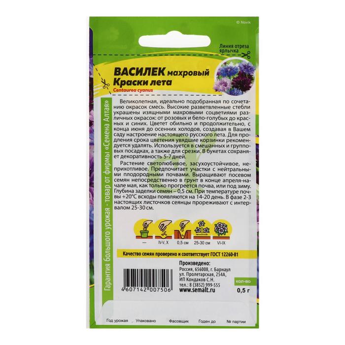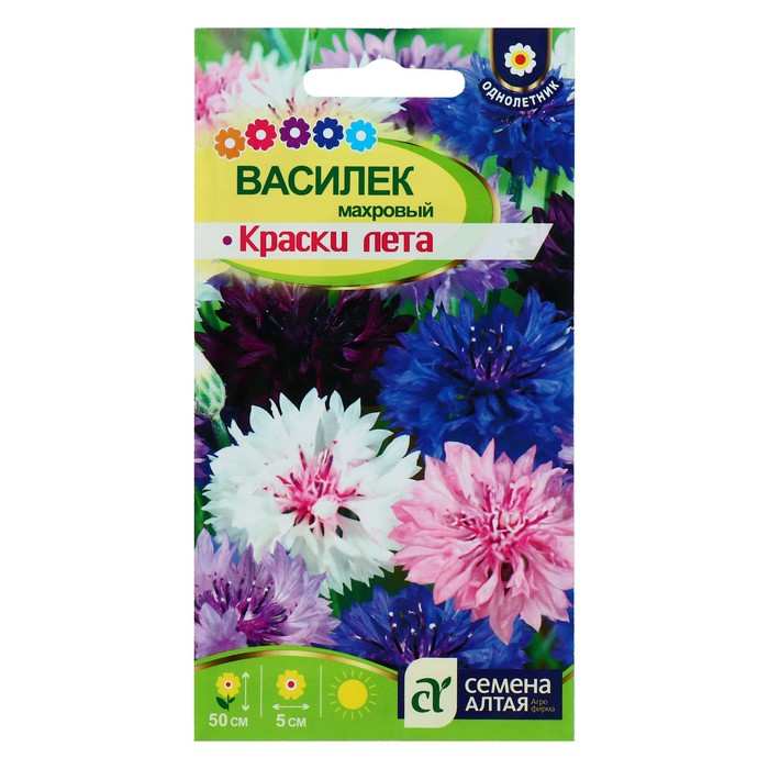 Великолепная, идеально подобранная по сочетанию окрасок смесь. Высокие разветвленные стебли украшены изящными махровыми соцветиями различных окрасок: от розовых и бело-голубых до красных и синих. Цветет обильно и продолжительно, с конца июня до осенних холодов, создавая в Вашем саду настроение настоящего русского лета. Для продления срока цветения увядшие корзинки рекомендуется удалять. Используется в смешанных и групповых посадках, а также для срезки. В букетах сохраняет декоративность 5-7 дней. Растение светолюбивое, засухоустойчивое, неприхотливое. Предпочитает участки с нейтральными плодородными почвами.