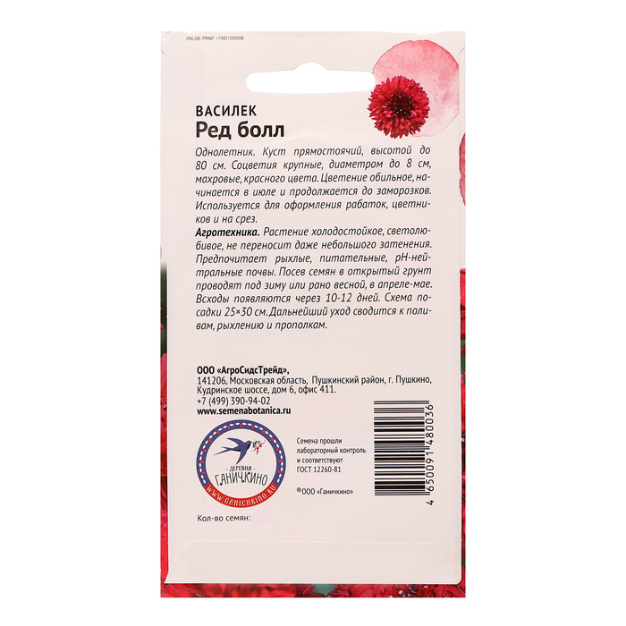 Однолетник. Куст прямостоячий, высотой до 80 см. Соцветия крупные, диаметром до 8 см, махровые, красного цвета. Цветение обильное, начинается в июле и продолжается до заморозков. Используется для оформления рабаток, цветников и на срез. Агротехника: Растение холодостойкое, светолюбивое, не переносит даже небольшого затенения. Предпочитает рыхлые, питательные, рН-нейтральные почвы. Посев семян в открытый грунт проводят под зиму или рано весной, в апреле-мае. Всходы появляются через 10-12 дней. Схема посадки 25×30 см. Дальнейший уход сводится к поливам, рыхлению и прополкам. Штрих-код – 4650091480036