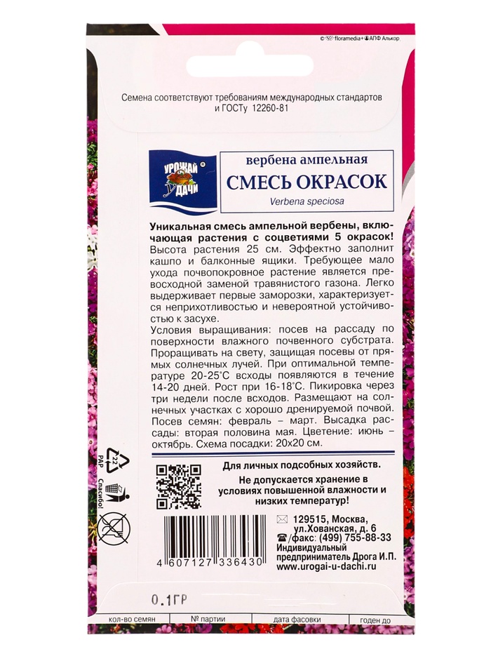Семена цветов Вербена амп.Смесь окрасок 0,1 г.