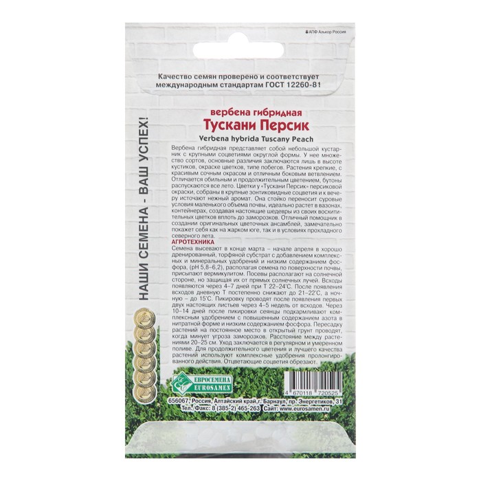 Семена цветов Вербена гибридная "Тускани Персик" (8 шт)