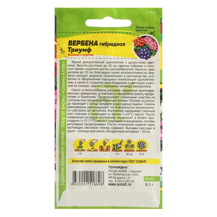 Яркий декоративный однолетник с душистыми цветками. Высота растения до 30 см. Цветки собраны в плотные яркие соцветия-щитки разнообразной окраски, диаметром до 10 см. Благодаря своей неприхотливости, вербена находит широкое применение в цветоводстве, особенно в оформлении парадных композиций однолетников, а также в создании миксбордеров и цветущих участков на газонах. Цветет с середины июня до заморозков. Свето- и теплолюбивое растение, устойчиво к недостатку влаги, вредителям и болезням. Переносит как высокие температуры, так и кратковременные заморозки. Предпочитает солнечные участки на суглинистых среднеудобренных почвах. Посевы на рассаду проводят с конца февраля в рассадные ящики. Семена равномерно раскладывают по поверхности увлажненного субстрата, не заделывая, а лишь слегка вдавливая в субстрат. Ёмкость с посевами накрывают непрозрачной плёнкой и помещают в тёплое (+25С) место, периодически проветривая. Всходы появляются на 4-7 день, пленку снимают, контейнер переносят в более прохладное (+15-17С) место с хорошим освещением. Через 4-5 недель сеянцы пикируют в отдельные горшочки. Высадка рассады в открытый грунт – в конце мая - июне, когда минует угроза возвратных заморозков. Посадочный интервал – 30 см.