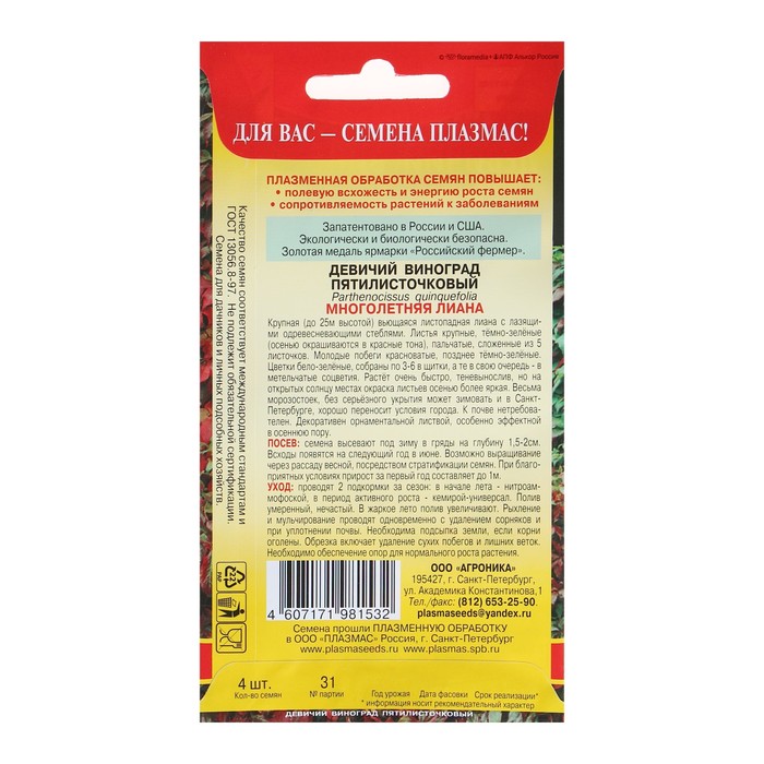 Крупная (до 25 м высотой) вьющаяся листопадная лиана с лазящими одревесневающими стеблями. Листья крупные тёмно-зелёные ( осенью окрашиваются в красные тона), пальчатые, сложенные из 5 листочков. Молодые побеги красноватые, позднее тёмно-зелёные. Цветки бело-зелёные, собраны по 3-6 в щитки, а те в свою очередь – в метельчатые соцветия. Растёт очень быстро, теневынослив, но на открытых солнцу местах окраска листьев осенью более яркая. Весьма морозостоек, без серьёзного укрытия может зимовать и в Санкт-Петербурге, хорошо переносит условия города. К почве нетребователен. Декоративен орнаментальной листвой, особенно эффектной в осеннюю пору.