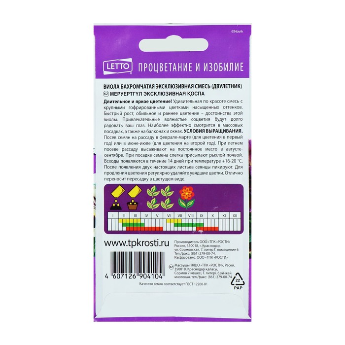 Быстрый рост, обильное и раннее цветение - достоинства этой виолы. Привлекательные волнистые соцветия будут долго радовать ваш глаз. Наиболее эффектно смотрятся в массовых посадках, а также на балконах и окнах. Для выращивания подходит любая хорошо дренированная почва и солнечное место или легкая полутень.Посев семян на рассаду февраль-март (для зацветания в первый год) или в июне-июле (для зацветания на второй год). При летнем посеве рассаду высаживают на постоянное место в августе-сентябре. При посадке семена слегка присыпают рыхлой почвой. Всходы появляются в течение 14 дней при температуре 16-20°С. После появления двух настоящих листьев сеянцы пикируют.