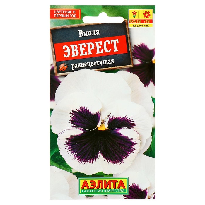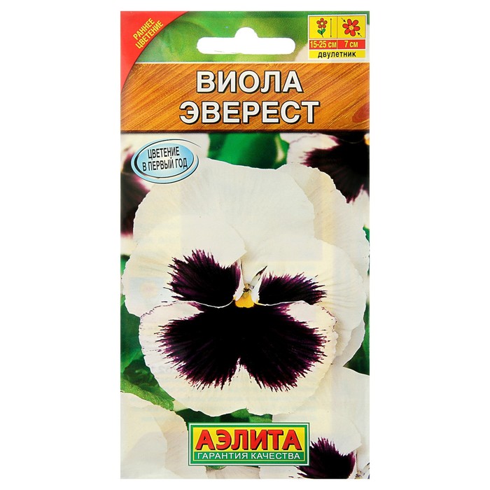 Прекрасная белая виола растёт в виде кустиков высотой до 20 см. «Эверест» очень обильно цветёт, на протяжении нескольких недель радуя садовода нежными крупными лепестками с фиолетовой серединой.