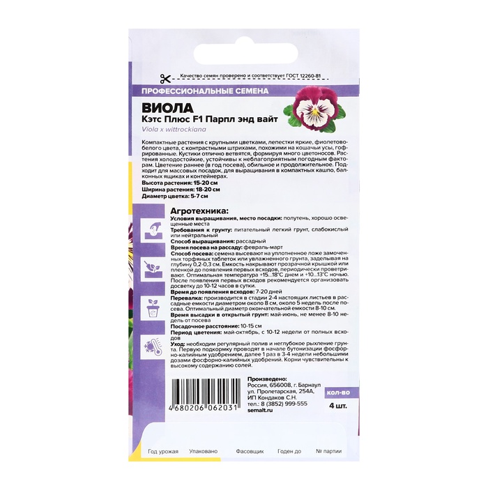 Цветочные семена «Виола цвета пурпурно-белого» станут ярким дополнением вашего сада или клумбы. Эти эффектные однолетники создадут весёлый летний ансамбль благодаря разноцветным лепесткам и кустистой форме. Подходят для высадки в открытый грунт и любят солнечный свет.
