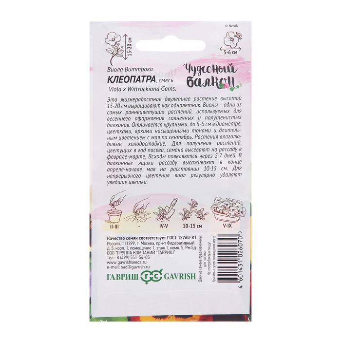 Это жизнерадостное двулетнее растение высотой 15-20 см, выращивают как однолетник. Виолы - одни из самых раннецветущих растений, используемых для весеннего оформления солнечных и полутенистых балконов. Отличается крупными, до 5-6 см в диаметре, цветками, яркими насыщенными тонами и длитель ным цветением с мая по сентябрь. Растения влаголюбивые, холодостойкие. Для получения растений, цветущих в год посева, семена высевают на рассаду в феврале-марте. Всходы появляются через 5-7 дней. В балконные ящики рассаду высаживают в конце апреля-начале мая на расстоянии 10-15 см. Для непрерывного цветения виол регулярно удаляют увядшие цветки.