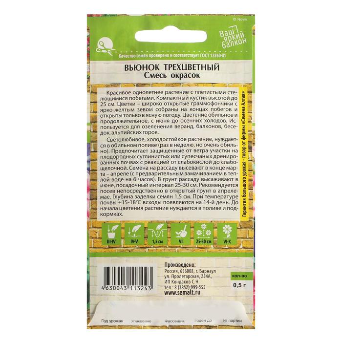 Красивое однолетнее растение с плетистыми стелющимися побегами. Компактный кустик высотой до 25 см. Цветки – широко открытые граммофончики ,с ярко-желтым зевом, собраны на концах побегов и открыты только в ясную погод . Цветение обильное и продолжительное – с июня до осенних холодов. Используется для озеленения веранд, балконов, альпийских горок. Растение засухоустойчивое, холодостойкое, предпочитает солнечные участки на рыхлых, питательных почвах. Рекомендуется посев непосредственно в открытый грунт в апреле – мае. Глубина заделки семян 1,5 см. При температуре почвы +15-18°C всходы появляются на 14-й день. До начала цветения растение нуждается в поливе и подкормках.