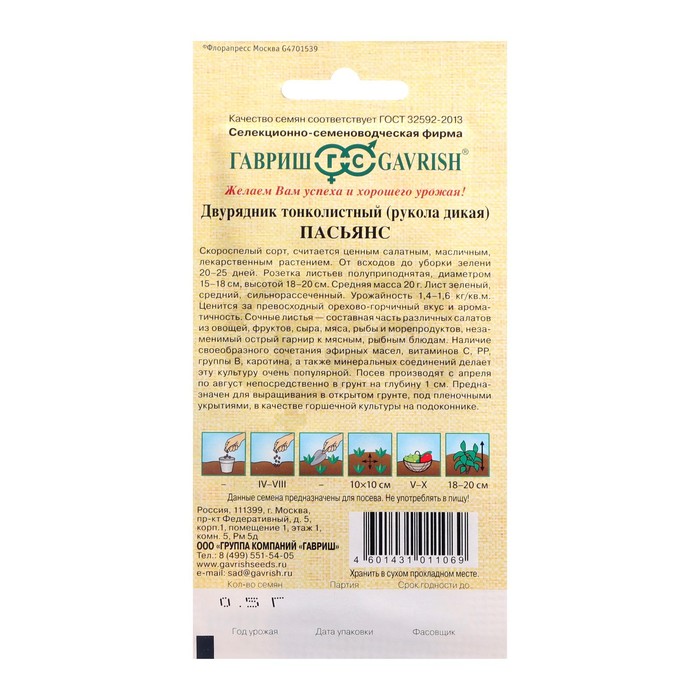 Скороспелый сорт, считается ценным салатным. Масличным, лекарственным растением. От всходов до уборки зелени 20–25 дней. Розетка листьев полуприподнятая, диаметром 15–18 см, высотой 18–20 см. Средняя масса 20 г. Лист зеленый, средний, сильнорассеченный. Урожайность 1,4-1,6 кг/м2. Ценится за превосходный орехово-горчичный вкус и ароматичность. Сочные листья — составная часть различных салатов из овощей, фруктов, сыра, мяса, рыбы и морепродуктов, незаменимый острый гарнир к мясным, рыбным блюдам. Наличие своеобразного сочетания эфирных масел, витаминов С, PP, группы В, каротина, а также минеральных соединений делает эту культуру очень популярной. Посев производят с апреля по август непосредственно в грунт на глубину 1 см. Предназначен для выращивания в открытом грунте, под пленочными укрытиями, в качестве горшечной культуры на подоконнике.