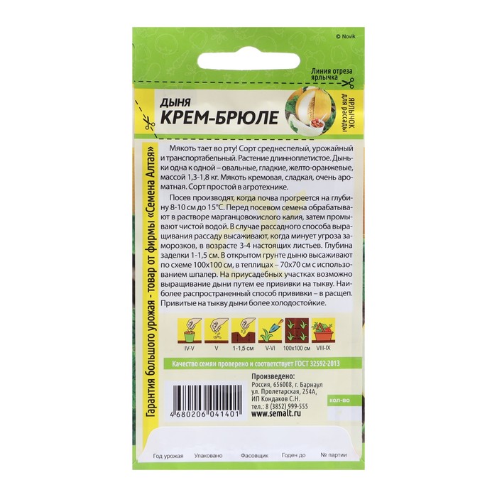 Прохладная мякоть тает во рту! Сорт среднеспелый, урожайный и транспортабельный. Растение длинноплетистое. Дыньки одна к одной – овальные, гладкие, желто-оранжевые, массой 1,3-1,8 кг. Мякоть кремовая, сладкая, очень ароматная. Сорт простой в агротехнике. Посев производят, когда почва прогреется на глубину 8-10 см до 15ºС. Перед посевом семена обрабатывают в растворе марганцовокислого калия, затем промывают чистой водой. В случае рассадного способа выращивания рассаду высаживают, когда минует угроза заморозков, в возрасте 3-4 настоящих листьев. Глубина заделки 1-1,5 см. В открытом грунте дыню высаживают по схеме 100х100 см, в теплицах — 70х70 см с использованием шпалер. На приусадебных участках возможно выращивание дыни путем её прививки на тыкву. Наиболее распространенный способ прививки — в расщеп. Привитые на тыкву дыни более холодостойкие.