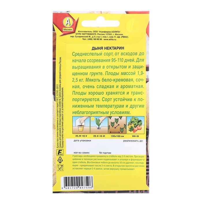 "Семена Дыня Нектарин. Среднеспелый сорт, от всходов до начала созревания 95-110 дней. Для выращивания в открытом и защищенном грунте. Плоды массой 1,9-2,5 кг. Мякоть бело-кремовая, сочная, очень сладкая и ароматная. Плоды хорошо хранятся и транспортируются. Сорт устойчив к пониженным температурам и другим неблагоприятным условиям.