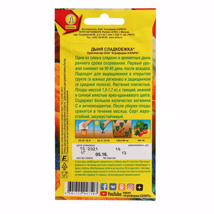 Среднеспелый сорт (90-95 дней от всходов до созревания плодов), предназначен для выращивания в открытом и защищенном грунте. Плоды округло-овальные, массой 1,5-1,7 кг. Мякоть оранжевая, нежная, очень сладкая и сочная, с приятным ароматом. Великолепный сорт для потребления в свежем виде.