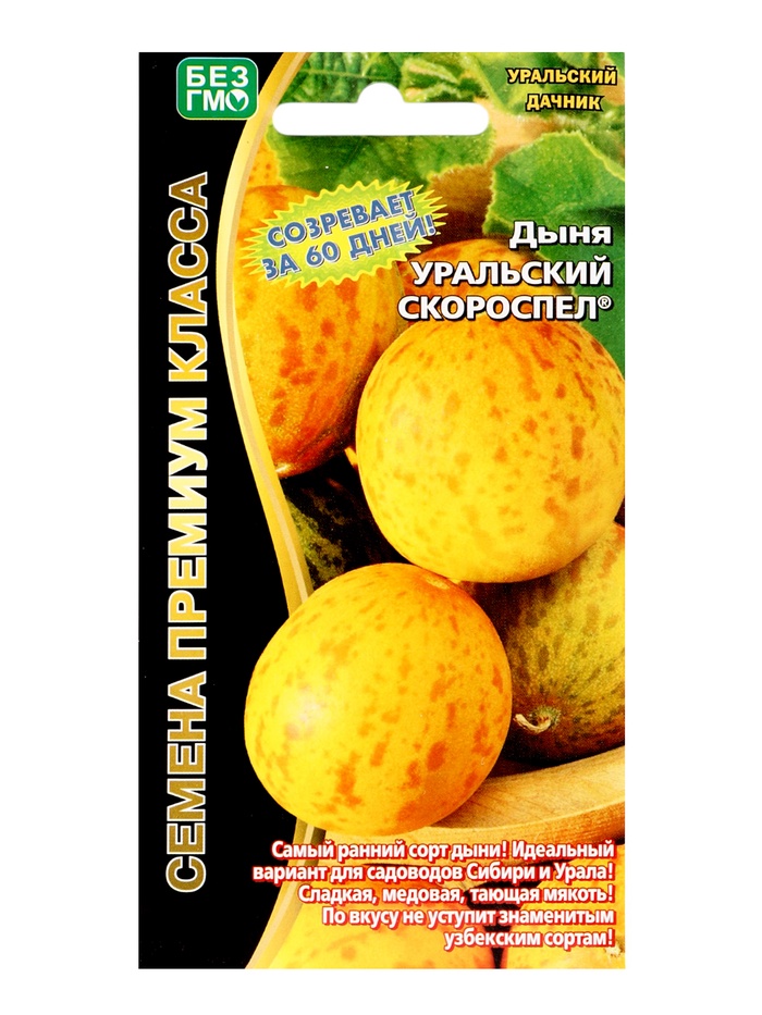 Очень ранний сорт, не имеющий аналогов, как в России, так и в ближнем зарубежье. Срок созревания 50-60 дней. Растение длинноплетистое. Плоды маленькие, массой 250-300 г, округлой формы, преимущественно гладкие, ярко-жёлтого и затем ярко-оранжевого цвета. Мякоть желтоватая, очень насыщенного сладкого вкуса. Это именно то, что давно ждал потребитель: дынька, которую можно съесть за один раз, не оставляя часть плода на потом.