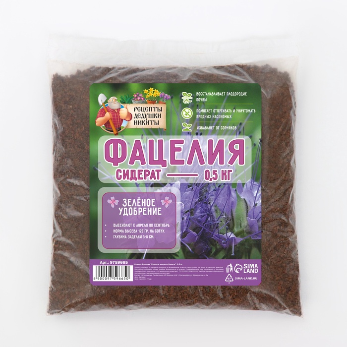 Универсальный вариант для огорода в любом регионе, этот сидерат улучшает почву по ряду показателей, а культивировать его очень просто.Виды применения:1) Медонос. Сбор меда с гектара посадки составляет 200 кг, на плодородных почвах – 300 кг. Даже несколько кустиков привлекут достаточно много насекомых-опылителей на участок.2) Корм скоту и птице. Польза фацелии в рационе животных в первую очередь связана с ее бактерицидными свойствами. Кроме того, это питательная зелень, которая не содержит никаких вредных веществ.3) Инсектицид. Растение отпугивает многих вредителей – нематод, тлей, проволочников, долгоносиков, саранчу и зерновку гороховую. А также приманивает хищных насекомых, питающихся цветоедами, листовертками, плодожорками.4) Фунгицид. На корнях фацелий живут бактерии, продуцирующие природные антибиотики. Поэтому овощи, растущие на участке после сидерата, не подвержены фитофторозу, гнилям и другим грибковым болезням. Преимущество фацелии в том, что она не состоит в родстве с овощными, злаковыми, ягодными, плодовыми культурами и не страдает ни одной огородной болезнью. Поэтому сеять сидерат можно после любых растений.Особенности: фацелия отличается редкой неприхотливостью.Морозостойкость: сидерат выдерживает похолодание до - 9°C, даже для молодых всходов безопасны заморозки до - 5°C.Засухоустойчивость: культура засухоустойчива, хорошо растет не только в залитых солнцем местах, но и в тени.Норма высева: 200 г семян на 100 кв. м. (на сотку).