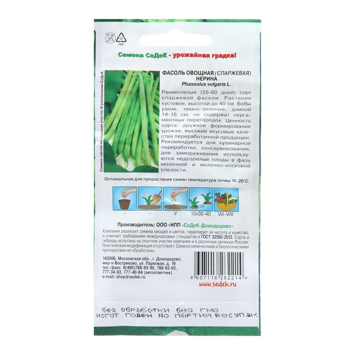 Раннеспелый (55-60 дней) сорт спаржевой фасоли. Растение кустовое, высотой до 40 см. Бобы узкие, темно-зеленые, длиной 14-16 см, не содержат пергаментных перегородок. Ценность сорта: дружное формирование урожая, высокие вкусовые качества переработанной продукции. Рекомендуется для кулинарной переработки, консервирования, для замораживания используются недозрелые плоды в фазу молочной и молочно-восковой спелости.