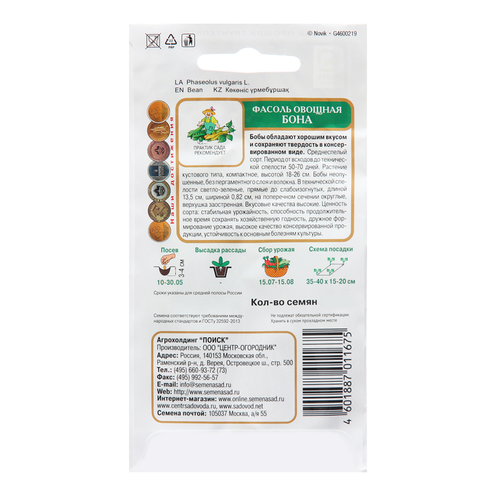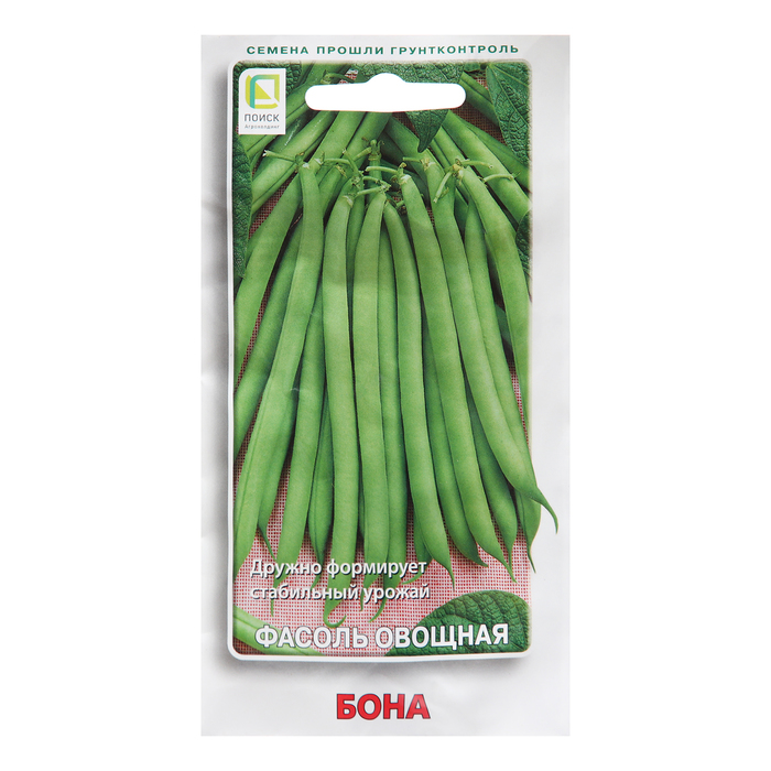 Фасоль овощная Бона - дружно формирует стабильный урожай. Спаржевая. Бобы обладают хорошим вкусом и сохраняют твердость в консервированном виде. Среднеспелый сорт. Период от всходов до технической спелости 50-60 дней. Растение кустового типа, компактное, высотой 18-26 см. Бобы неопушенные, без пергаментного слоя и волокна. В технической спелости светло-зеленые, прямые до слабоизогнутых, длиной 13,5 см, шириной 0,82 см, на поперечном сечении округлые, верхушка заостренная. Вкусовые качества высокие. Семена белые. Ценность сорта: стабильная урожайность, способность продолжительное время сохранять хозяйственную годность, дружное формирование урожая, высокое качество консервированной продукции, устойчивость к основным болезням культуры.
