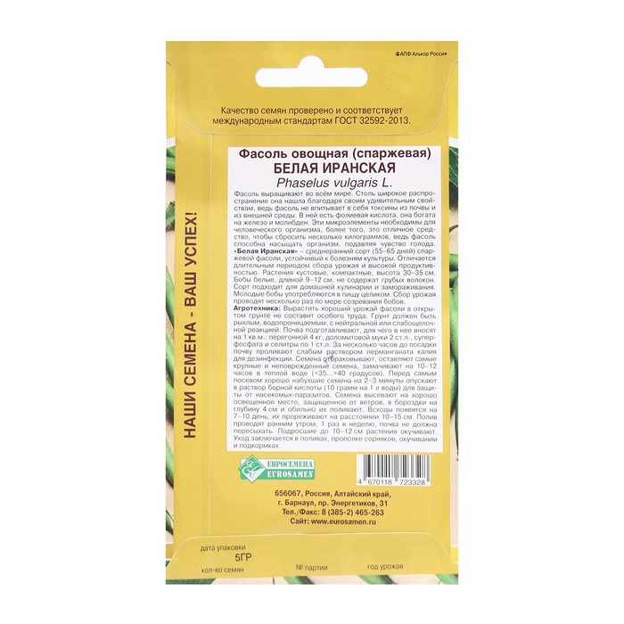 "Белая Иранская" -среднеранний сорт (55-65 дней) спаржевой фасоли, устойчивый к болезням культуры.