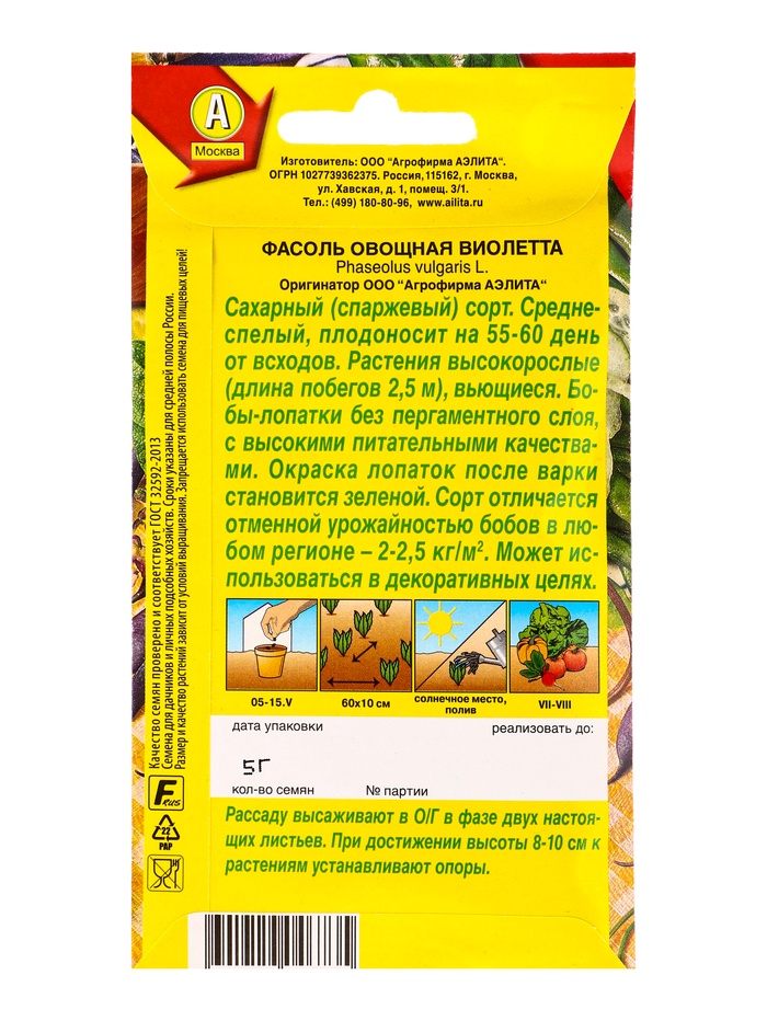 Семена Фасоль овощная Виолетта Ор. А, Ц/П,5 г