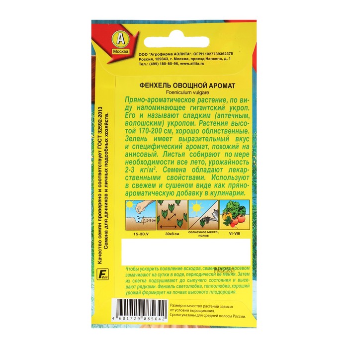 Фенхель «Аромат», похожий на гигантский укроп, вырастает до 2 м в высоту. Веточки и листья этого сорта станут лучшей приправой к мясным и овощным блюдам, придав им характерный анисовый аромат.