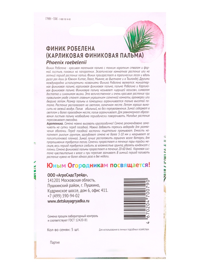 Семена Финик Робелена (карликовая финиковая пальма) 5шт Детская грядка
