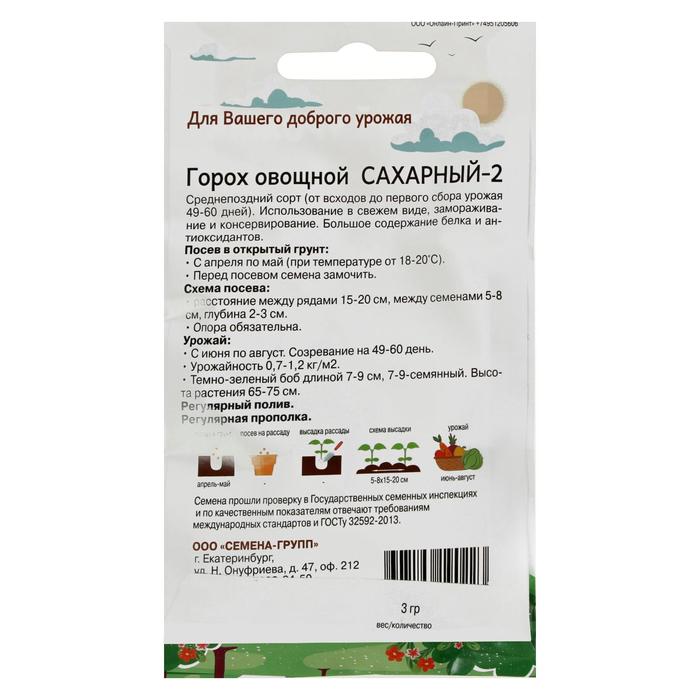 Среднеранний (55-64 дней от всходов до начала сбора бобов) сорт сахарного гороха. Растение высотой 100-110 см. Бобы слабоизогнутые, длиной 10 см, широкие, в технической спелости светло-зеленые, с 6-8 горошинами. Стенки бобов толстые, отличного вкуса, без пергаментного слоя и волокна. Бобы богаты фруктозой и глюкозой. Используется в свежем виде, для домашней кулинарии, консервирования и замораживания. Урожайность 0,6-1,3 кг/м2. Посев производят ранней весной на солнечной стороне участка на глубину 4-6 см. Схема посева: 15x30 см. Растения нуждаются в опоре.