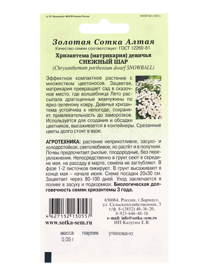Семена Хризантема Снежный шар /Сотка/ 0,05г/ бел. махр. девичья h-30см, d-4см/*1800