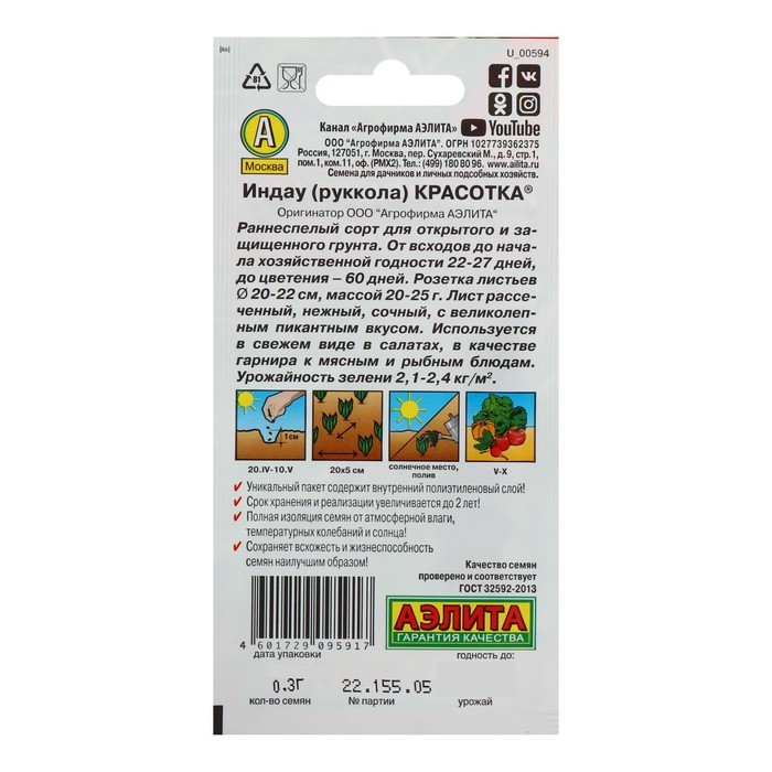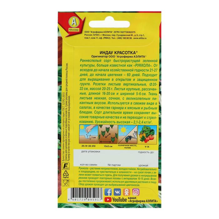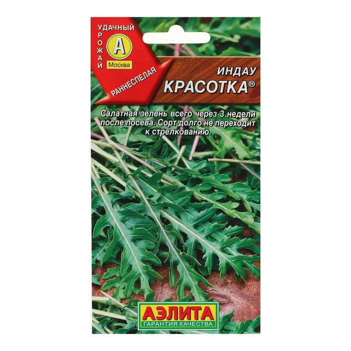«Красотка» — это раннеспелый сорт индау, у которого период от всходов до начала хозяйственной годности длится 22–27 дней. Он долгое время сохраняет высокие товарные качества и не переходит к стрелкованию. Выращивается в открытом и защищённом грунте. Урожайность составляет 2,1–2,4 кг/м².