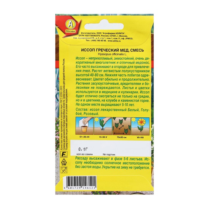 Иссоп – неприхотливый, зимостойкий, очень декоративный многолетник и отличный медонос. Его часто высаживают в огороде для привлечения пчел. Растет ветвистым полукустарником высотой 40-80 см. Нижняя часть побегов одревесневает. Цветет обильно и продолжительно. Растения засухоустойчивые, вредителями и болезнями не повреждаются. Листья и цветки используются в медицине и кулинарии. Иссоп будет отлично смотреться не только на грядке, но и в цветнике, на клумбе и каменистой горке. На одном месте выращивают 5-10 лет.Рассаду высаживают в фазе 5-6 листьев. Иссопу необходимо солнечное местоположение без застоя воды. Укрытие на зиму не требуется.
