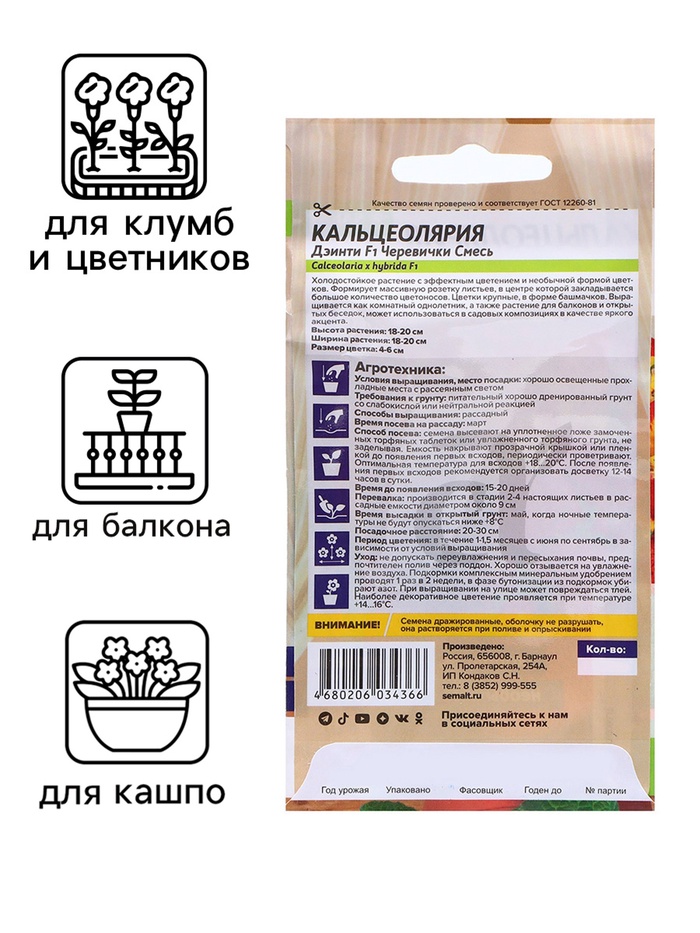 Сорт с крупными, оригинальными соцветиями. Традиционное садовое растение, широко используемое для оформления различных цветников и на срезку. Цветет до заморозков. Нежный обильноцветущий однолетник, который в домашних условиях выращивается как многолетник. Привлекательное растение, высотой до 20 см, с оригинальными цветками, похожими на башмачки. Яркая цветовая гамма смеси включает красные, желтые, оранжевые и двухцветные оттенки. Кальцеолярия прекрасно подходит для высадки на клумбы, в рабатки и миксбордеры, будет великолепным украшением комнаты и балкона. Светолюбивое, холодостойкое растение. Кальцеолярия отзывчива на обильный полив и высокую влажность воздуха, но не любит прямого опрыскивания листьев. Семена высевают в марте поверхностно, не заделывая, а лишь слегка вдавливая в грунт. Посевы увлажняют, накрывают стеклом и помещают в светлое место. Для получения наилучшего результата посев рекомендуем проводить в торфяные таблетки (одно драже в таблетку). Всходы появляются на 15-20 день, им необходима защита от прямых солнечных лучей. Зацветает через три месяца от появления всходов. Высадка в открытый грунт – в конце мая – июне. Посадочный интервал 20 см. Оптимальная температура в период цветения + 12-15°С, в зимний период снизить до +10-12°C. Внимание! Семена дражированные - оболочку драже не разрушать