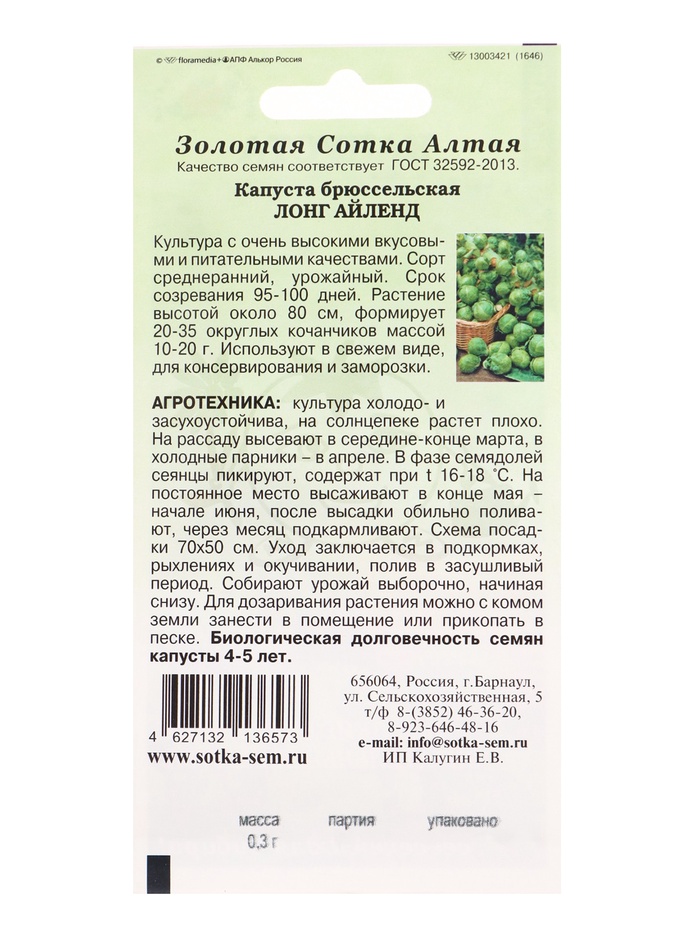 Семена Капуста брюссельская Лонг Айленд /Сотка/ 0,3г/ среднеран. 10-20г/*1200