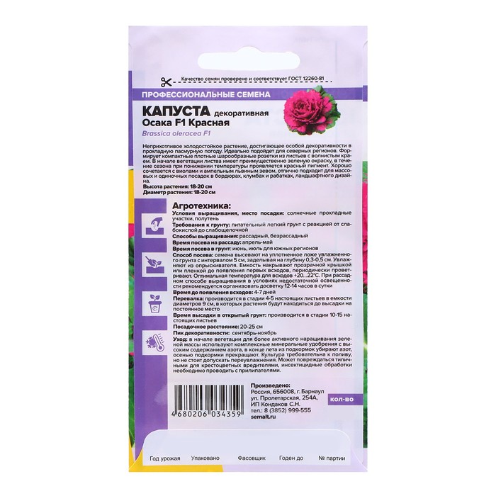Неприхотливое холодостойкое растение, достигающее особой декоративности в прохладную пасмурную погоду. Идеально подойдет для северных регионов. Формирует компактные плотные шарообразные розетки из листьев с волнистым краем. В начале вегетации листва имеет преимущественно зеленую окраску, в течение сезона при понижении температуры проявляется красный пигмент. Хорошо сочетается с виолами и ампельным львиным зевом, отлично подходит для массовых и одиночных посадок в бордюрах, клумбах и рабатках, ландшафтного дизайна.. Высота растения: 18-20 см. Диаметр растения: 18-20 см. Условия выращивания, место посадки: солнечные прохладные участки, полутень.Требования к грунту: питательный легкий грунт с реакцией от слабокислой до слабощелочной. Способы выращивания: рассадный, безрассадный. Время посева на рассаду: апрель-май. Время посева в грунт: июнь, июль для южных регионов. Способ посева: семена высевают на уплотненное ложе увлажненного грунта с интервалом 5 см, заделывая на глубину 0,3-0,5 см. Увлажняют из опрыскивателя. Емкость накрывают прозрачной крышкой или пленкой до появления первых всходов, периодически проветривают. Оптимальная температура для всходов +20…22°С. При рассадном способе выращивания в условиях недостаточной освещенности рекомендуется организовать досветку 12-14 часов в сутки. Время до появления всходов: 4-7 дней. Перевалка: производится в стадии 4-5 настоящих листьев в емкости диаметров 9 см, в которых растения будут находиться до высадки на постоянное место. Время высадки в открытый грунт: производится в стадии 10-15 настоящих листьев. Посадочное расстояние: 20-25 см. Пик декоративности: сентябрь-ноябрь. Уход: в начале вегетации для более активного наращивания зеленой массы используют комплексные минеральные удобрения с высоким содержанием азота, в конце лета из подкормок убирают азот, осенью подкормки прекращают. Культура требовательна к поливу, но не стоит допускать переувлажнения. Может повреждаться типичными для крестоцветных вредителями, инсектицидные обработки необходимо проводить с прилипателями.