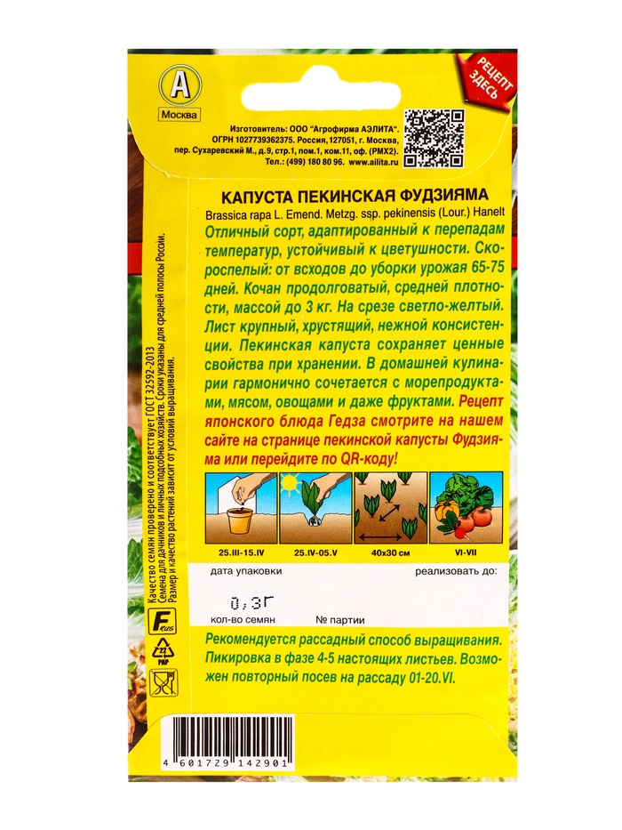 Семена Капуста пекинская Фудзияма Ср Блюда стран мира, Ц/П,0,3 г