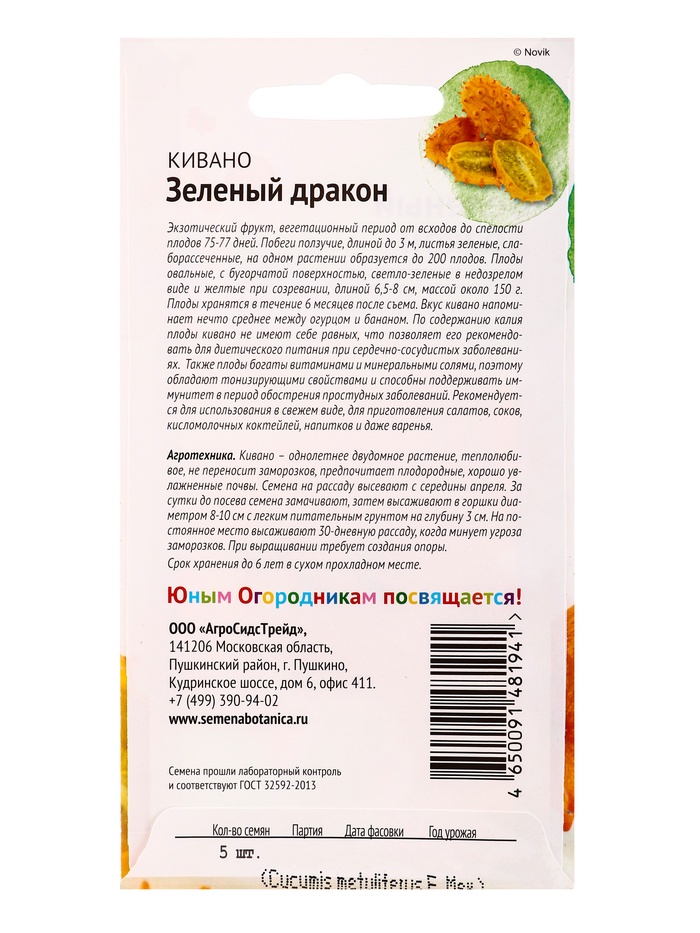 Семена Кивано «Зелёный дракон», 5 шт., «Детская грядка»