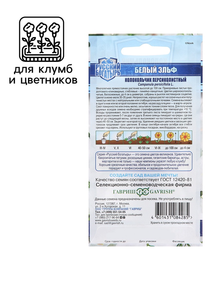 Многолетнее прямостоячее, слабоветвистое растение, высотой до 100. Прикорневые листья продолговато-клиновидные, стеблевые – линейно-ланцетные. Листья лоснящиеся, с зубчатым краем. Цветки ширококолокольчатые, белоснежные, до 4 см в диаметре, собраны в рыхлое кистевидное соцветие. Цветет в июне-июле 30-35 дней. Неприхотлив, хорошо развивается на солнечных или полутенистых на дренированных, с достаточным питанием нейтральных или слабощелочных почвах. Используется в групповых посадках, миксбордерах, на срезку.
