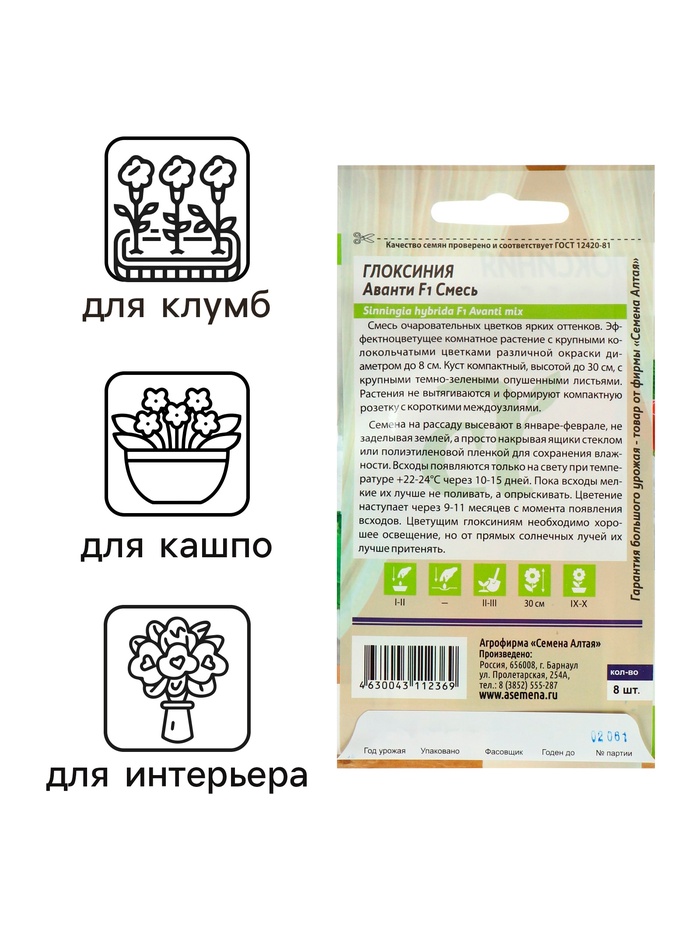 Семена на рассаду сеют в январе-феврале, не заделывая землей, а просто накрывая ящики стеклом или полиэтиленовой пленкой для сохранения влажности. Всходы появляются только на свету при температуре 22-24°С через 10-15 дней. Пока всходы мелкие, их лучше не поливать, а опрыскивать. Цветение наступает через 9-11 месяцев с момента появления всходов. Цветущим глоксиниям необходимо хорошее освещение, но от прямых солнечных лучей их лучше притенять.
