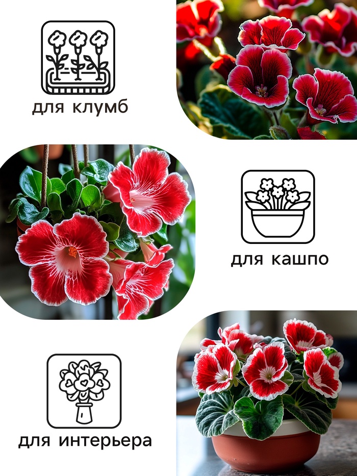 Эффектноцветущее комнатное растение с крупными красными с белой полосой по краю колокольчатыми цветками диаметром до 8 см. Куст компактный высотой до 30 см., с крупными темно-зелеными опушенными листьями. Растения не вытягиваются и формируют компактную розетку с короткими междоузлиями.