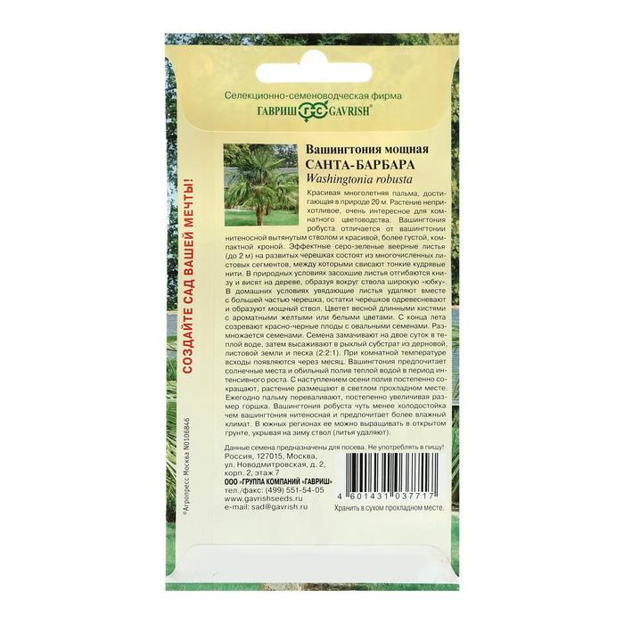 «Санта-Барбара» — это красивая многолетняя пальма, которая в природе достигает 20 м в высоту. Отличается от нитеносной вашингтонии вытянутым стволом и густой компактной кроной.