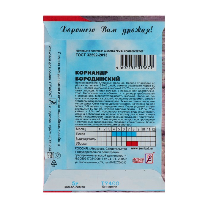 Однолетнее засухо- и холодостойкое растение. Сорт среднеспелый. От массовых всходов до сбора зелени 40-45 дней, до созревания семян - 80-90 дней. Растение компактное, высотой 70-75 см, обладает приятным нежным вкусом и изысканным ароматом. Листья используют в кулинарии, семена - для ароматизации кондитерских изделий и хлеба, при приготовлении пряных смесей. Кориандр – это отличный медонос и лекарственное растение, обладающее желчегонным, болеутоляющим и ранозаживляющим свойствами, используемое при простудных и желудочных заболеваниях.