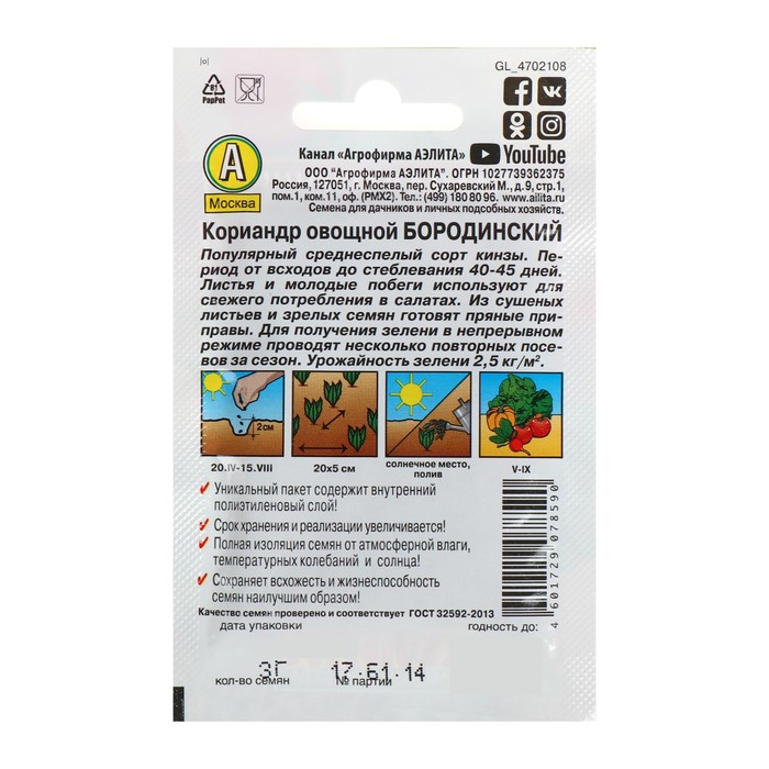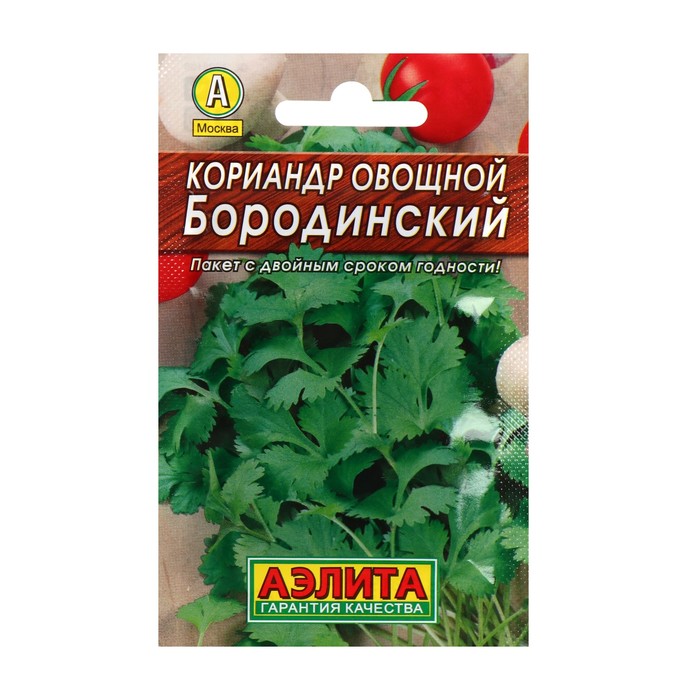«Бородинский» — это среднеспелый сорт кориандра, у которого период от полных всходов до начала стеблевания длится 40–45 дней. Зелень обладает приятным нежным вкусом и изысканным ароматом. Она используется в свежем виде для оформления блюд и в салатах.