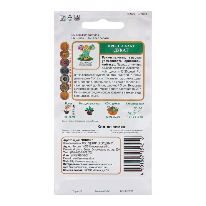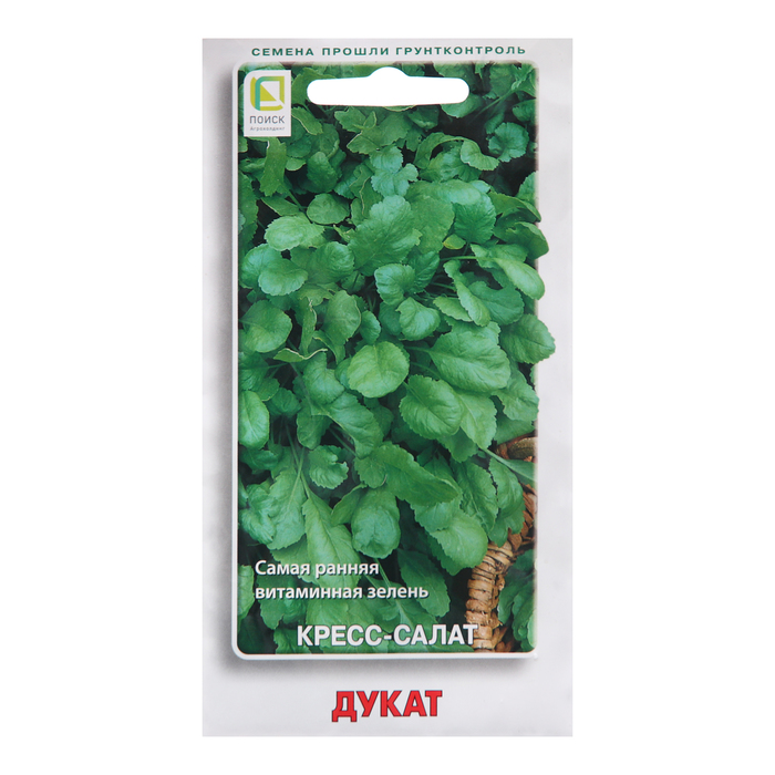 Кресс-салат Дукат - самая ранняя витаминная зелень. Раннеспелость, высокая урожайность, оригинальный вкус. Период от полных всходов до начала хозяйственной годности 18-22 дня. Розетка листьев полуприподнятая, высотой 20 см, диаметром 15-18 см. Листовая пластинка цельная, зеленая, яйцевидная, по краю слабоволнистая, длиной до 12 см, шириной 3 см. Вкусовые качества хорошие. Масса одного растения 15-20 г. Рекомендуется для использования в свежем виде молодых листьев.