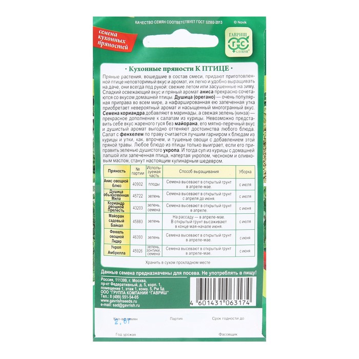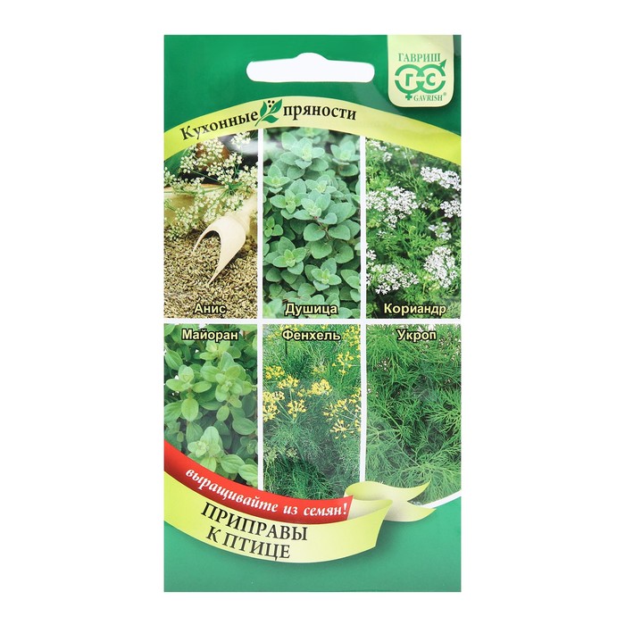 Пряные растение (анис, душица, кориандр, майоран, фенхель, укроп), вошедшие в состав смеси придают приготовленной птице неповторимый вкус и аромат, их легко и удобно выращивать на даче, они всегда под рукой, свежие — летом или засушенные на зиму. Сладкий, освежающий вкус и пряный аромат аниса прекрасно сочетается со вкусом домашней птицы. Душица (орегано) очень популярная приправа во всем мире, а нафаршированная ею запеченная утка приобретает невероятный аромат и насыщенный многогранный вкус. Семена кориандра добавляют в маринады. Невозможно представить себе вкус жареного гуся без майорана, его мятно-перечный вкус и душистый аромат выгодно оттенит достоинства любого блюда. Салат с фенхелем по праву считается лучшим гарниром к блюдам из курицы и утки, как, впрочем, и любые тушеные овощи с добавлением этой пряной травы. Любое блюдо только выиграет, если его приправить зеленью душистого укропа. Сухой порошок из семян и засушенной зелени лучше всего подходит для натирания птицы перед запеканием, а если добавить в смесь оливковое масло и чеснок, то кулинарный шедевр обеспечен.