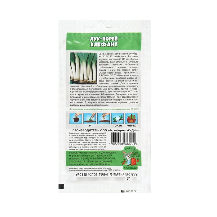 Среднеспелый (период от полных всходов до уборки 140-160 дней), морозоустойчивый сорт. Имеет прекрасные вкусовые качества. Растение высотой 65-85см. Листья сизо-зеленые, без антоциана, с сильным восковым налетом, нарастают до глубокой осени, когда другие виды лука уже не дают зелени. «Нога» длиной 10-25см, 2-3 см в диаметре, со слабовыраженной луковицей. Масса растения 200г. Урожайность 3,2-3,8кг/м². Вкус острый. Рекомендуется для использования в свежем виде, кулинарии и для зимнего хранения. В нем содержатся витамины С, Е, B1, В2, РР, каротин. Лук-порей улучшает деятельность печени и желчного пузыря, повышает аппетит.