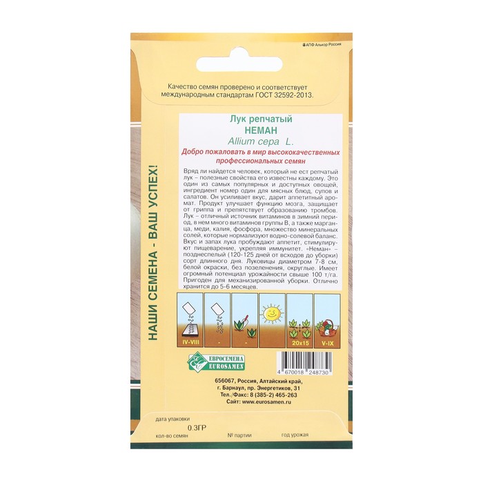 Среднеспелый (115-125 дней от всходов до полегания листьев) сорт лука. Рекомендуется для выращивания в однолетней культуре из семян. Посев в грунт производят в конце апреля — начале мая на глубину 1-1,5 см. Для получения более крупных луковиц выращивают рассадным способом. Посев семян на рассаду проводят в марте, высадку рассады в открытый грунт — в начале мая. Луковица округлая или слегка удлиненная, плотная, массой 150-180 г. Покровные чешуи белого цвета, практически не зеленеют, плотно прилегают к луковице. Отличается высокой выравненностью продукции. Вкус полуострый. Пригоден для употребления в свежем виде, хранения и сушки. Хранится более 6 месяцев. Урожайность очень высокая — до 8 кг/м2.