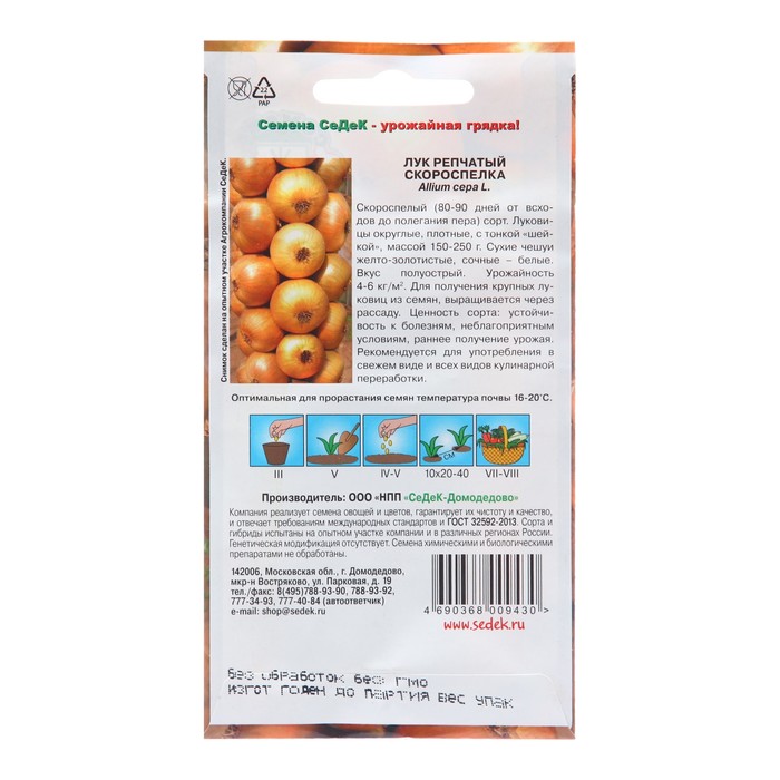 Скороспелый (80-90 дней от всходов до полегания пера) сорт. Луковицы округлые, плотные, с тонкой «шейкой», массой 150-250 г. Сухие чешуи желто-золотистые, сочные – белые. Вкус полуострый. Урожайность 4-6 кг/м2 . Для получения крупных луковиц из семян, выращивается через рассаду. Ценность сорта: устойчивость к болезням, неблагоприятным условиям, раннее получение урожая. Рекомендуется для употребления в свежем виде и всех видов кулинарной переработки.
