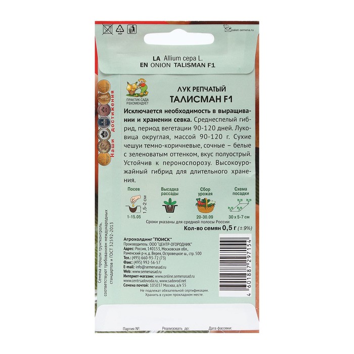 Семена лука репчатого Талисман F1 порадуют начинающих садоводов, так как этот сорт не требует сложного ухода. Через 110 дней после появления ростков можно собирать первый урожай. Округлые красивые луковицы покрыты темно-коричневой шелухой, под которой скрываются зеленовато-белые сочные чешуйки. Лук репчатый Талисман F1 относится к высокоурожайным сортам. Собранные овощи надолго сохраняют товарный вид и могут храниться на протяжении многих месяцев вплоть до сбора нового урожая. Этот полуострый сорт используется для приготовления салатов, супов и вторых блюд.