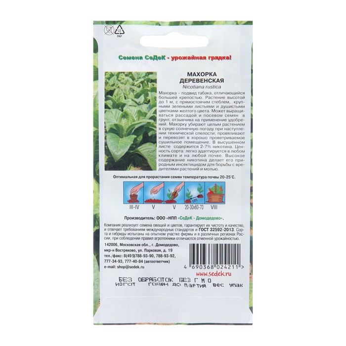 Махорка – подвид табака, отличающийся большей крепостью. Растение высотой до 1м, с прямостоячим стеблем, крупными зелеными листьями и душистыми цветками желтого цвета. Может выращиваться рассадой и посевом семян в грунт, отзывчива на применение удобрений. Махорку убирают целым растением в сухую солнечную погоду при наступлении технической спелости; провяливают и перевозят в хорошо проветриваемое сушильное помещение. В высушенном листе содержится 2-7% никотина. Ценность сорта: легко адаптируется в любом климате и на любой почве. Высокое содержание никотина делает его природным инсектицидом для борьбы с вредителями растений и молью.