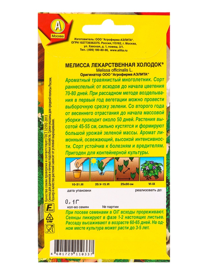 Семена Мелисса лекарственная Холодок , Ц/П,0,1 г