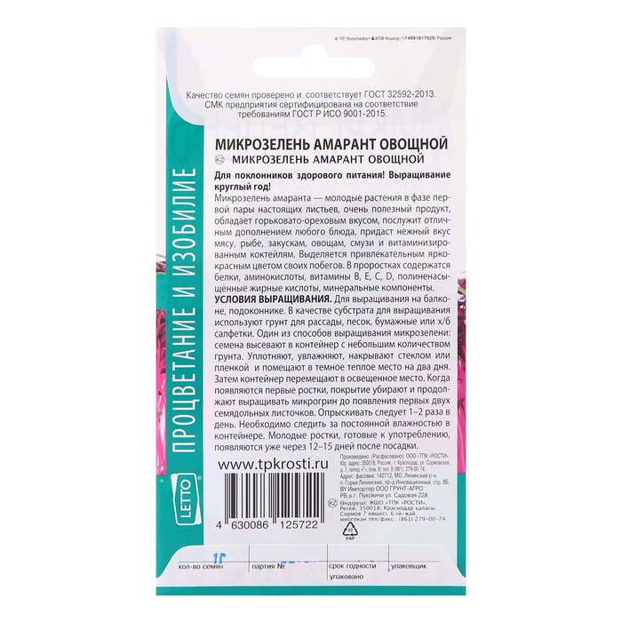 Семена Амаранта овощного - источник растительного белка. Микрозелень амаранта является очень полезным продуктом, обладая горьковато-ореховым вкусом, послужит отличным дополнением любого блюда, придаст нежный вкус мясу, рыбе, закускам, овощам, смузи и витаминизированным коктейлям. В проростках содержатся белки, аминокислоты, витамины В, Е, С, D, полиненасыщенные жирные кислоты, минеральные компоненты. Ежедневное употребление ростков амаранта даже в небольших количествах способствует оздоровлению и омоложению организма.