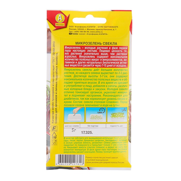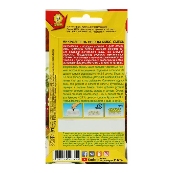 Спелая зелень содержит микроэлементы, полезные вещества, имеет приятный сладковатый привкус, который выгодно подчеркнёт кулинарные творения повара. Свёкла вырастает до 25 см. Посаженный в грунт или стерильный субстрат семян даёт всходы через 7 дней, достигает технической зрелости через 3 дня, при хорошем освещении и поливе вырастает крупным и сочным. Схема посадки — 0,5 × 0,5 см, глубина заделки — 1 см.