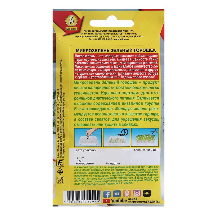Микрозелень Зеленый горошек – продукт низкой калорийности, богатый белком, легко усваивается. Идеально подходит для сторонников диетического питания. Отличается высоким содержанием витаминов группы В и антиоксидантов. Молодую зелень рекомендуется использовать в качестве гарнира, в составе салатов, отваривать или тушить в сливках. Состав: горох овощной Триумф.